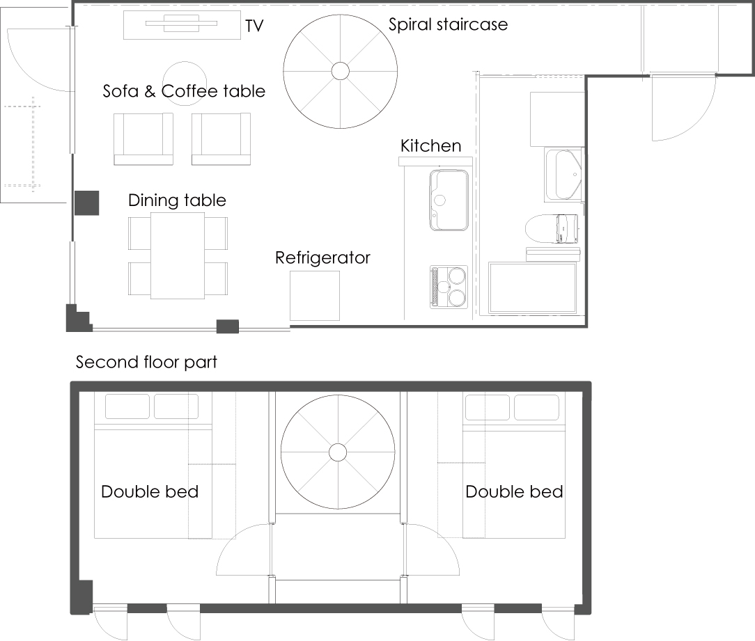 | Kitchen | Cookware, IH stove, Dishes, Cutlery, Saucepot, Flying-pan, Knives, Cutting Board, Mugs, Glasses |