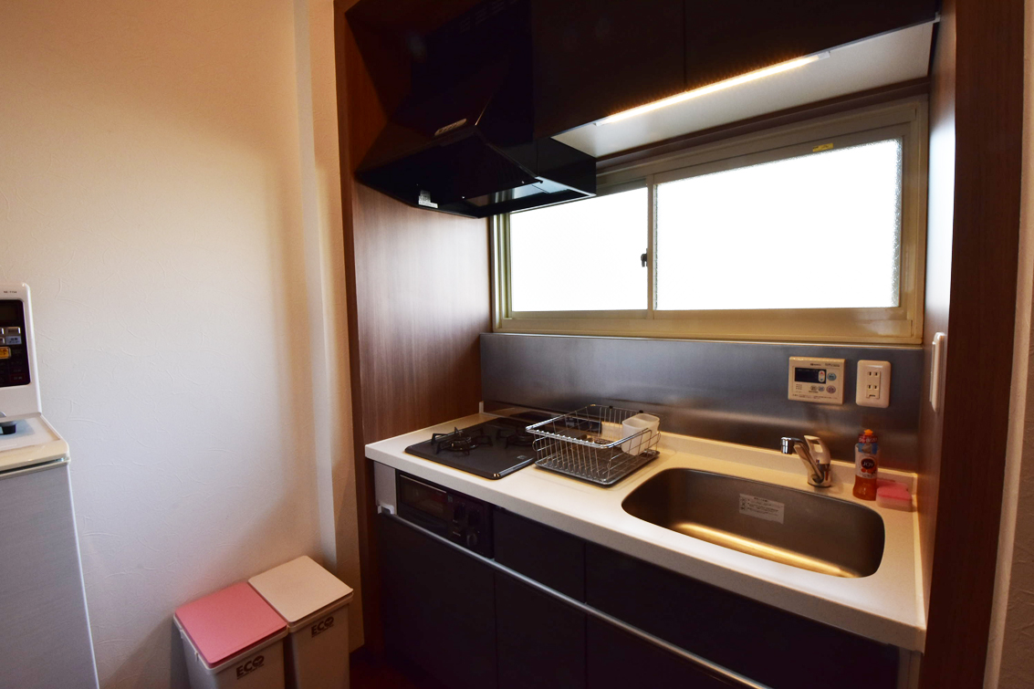 | Kitchen | Cookware, Two-burner Gas Range, Dishes, Cutlery, Saucepot, Flying-pan, Knives, Cutting Board, Mugs, Glasses |